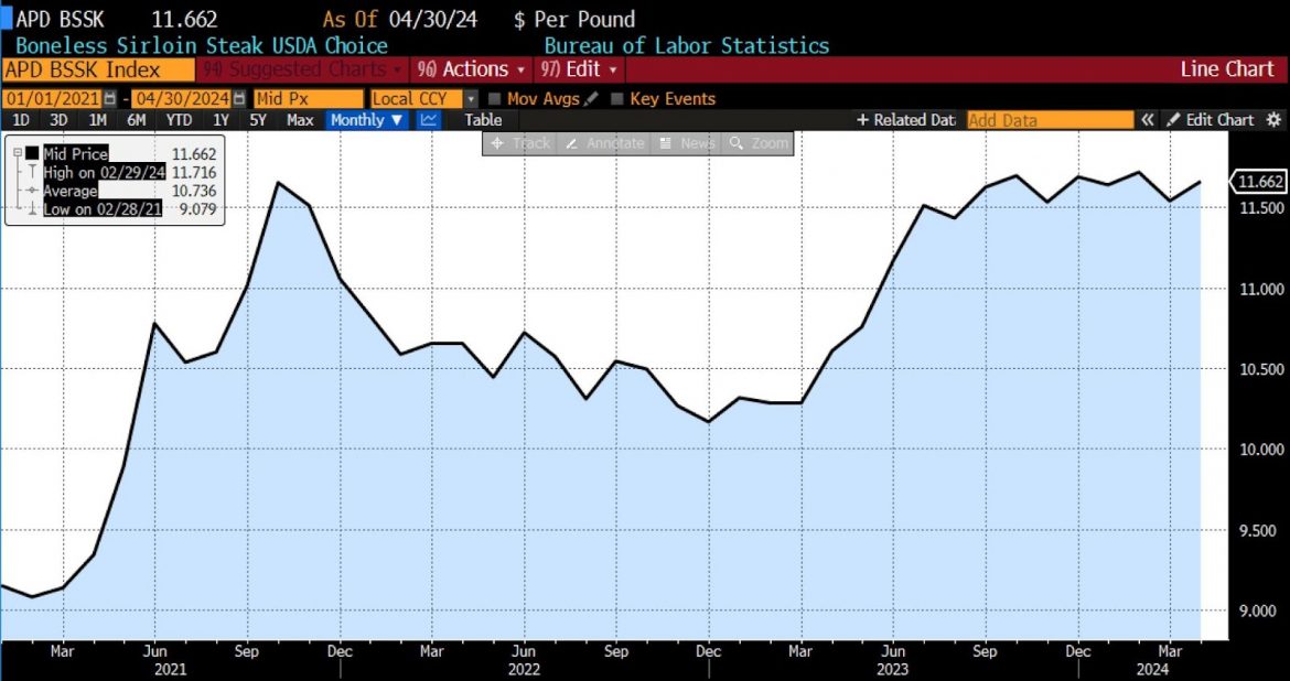 In January 2021, the Bureau of Labor Statistics reported in their consumer prices summary that the average price of a boneless sirloin steak was $9.418. By April 2024 that price had risen 27.5 percent to $11.662.