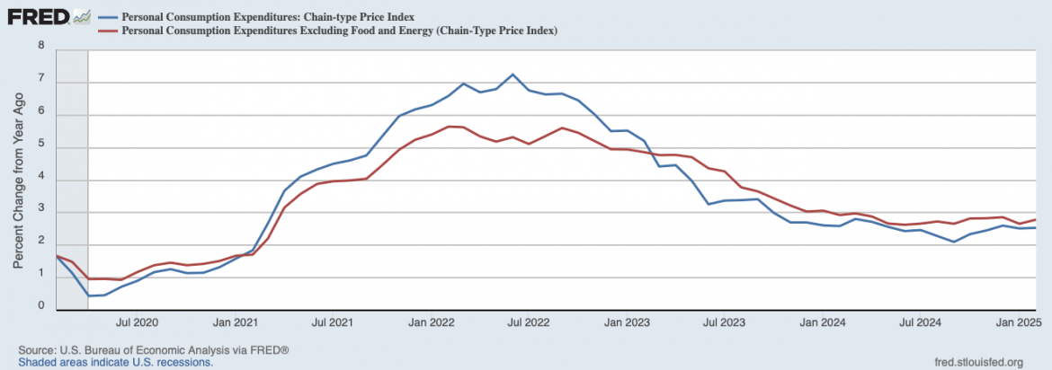 The professional forecasters were right: inflation remained elevated in February. The Personal Consumption Expenditures Price Index (PCEPI), which is the Federal Reserve’s preferred measure of inflation, grew at an annualized rate of 4.0 percent in February 2025, down from 4.1 percent in the prior month. PCEPI inflation has averaged 3.1 percent over the last six months and 2.5 percent over the last twelve months.