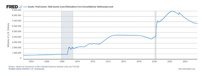 Let’s start with the Fed’s massive balance sheet. During the 2008 financial crisis and COVID-19 pandemic, the Fed expanded its asset holdings from around $800 billion to nearly $9 trillion—that is, $9,000 billion. Then, in 2022, the Fed began slowly shrinking its balance sheet. It is not actively selling assets. Rather, it is not replacing a portion of its maturing bonds. The Fed intends to use this “balance sheet runoff” approach to transition from an abundant reserves to an ample reserves regime.