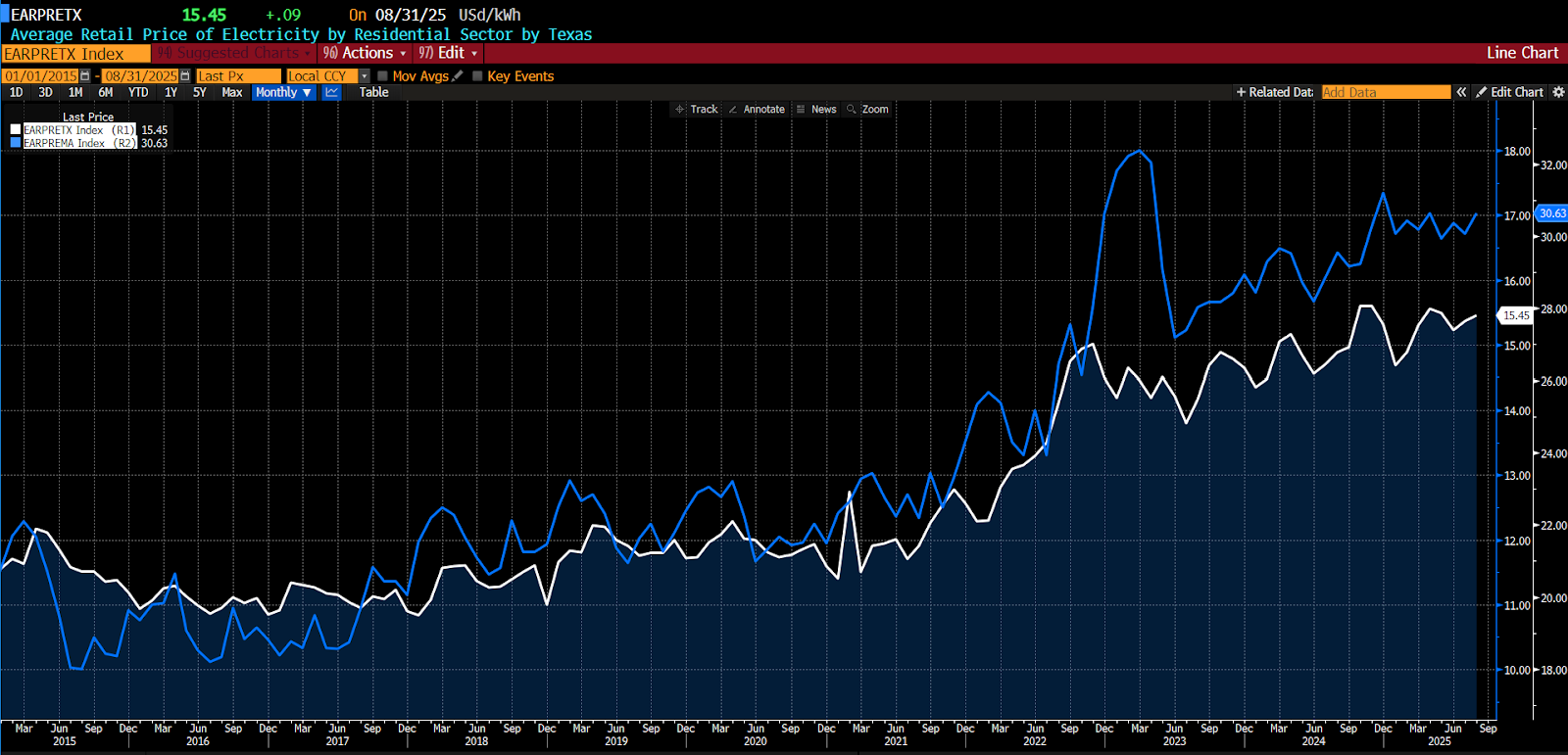 Average Retail Price of Residential Electricity, Massachusetts (blue) vs. Texas (white), 2015 – present