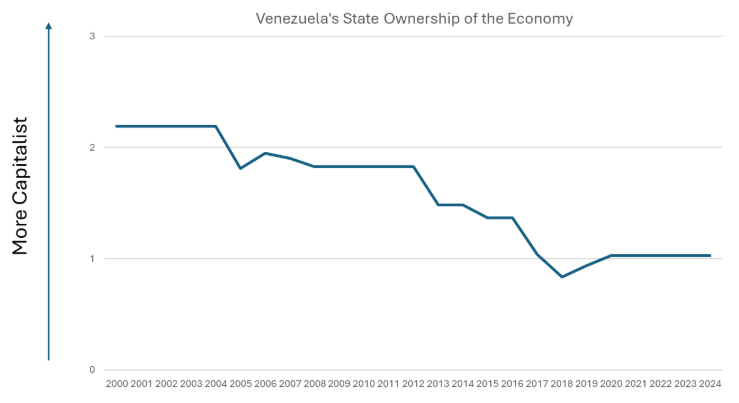 When Hugo Chavez introduced socialism in Venezuela in 2005, he claimed that he was re-inventing socialism so as to avoid the outcomes of the Soviet Union, stating that they would “develop new systems that are built on cooperation, not competition.” And that they “cannot resort to state capitalism.” Bernie Sanders famously endorsed this socialism, saying that the American dream was more likely to be realized in places like Venezuela and calling the United States a banana republic in comparison. Nobel laureate economist Joe Stiglitz was quick to point out the “very impressive” growth rates and the eradication of poverty. But socialism in Venezuela, according to the state ownership of the economy measure from Varieties of Democracy, corresponded to the classic definition of socialism, leading to the very blackouts, empty grocery shelves, and suppression of political freedom socialists explicitly sought to avoid.