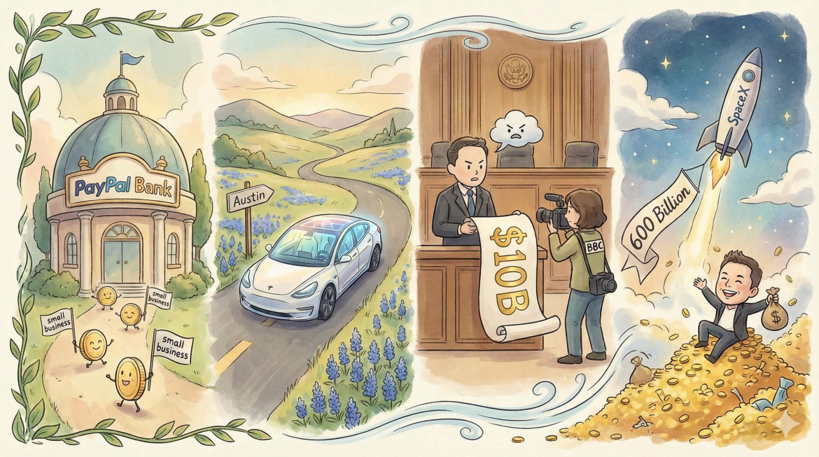 Here is your cheat sheet: PayPal is eyeing a banking charter, Tesla is testing driverless tech in Texas, and SpaceX just made Elon Musk wealthier than ever.