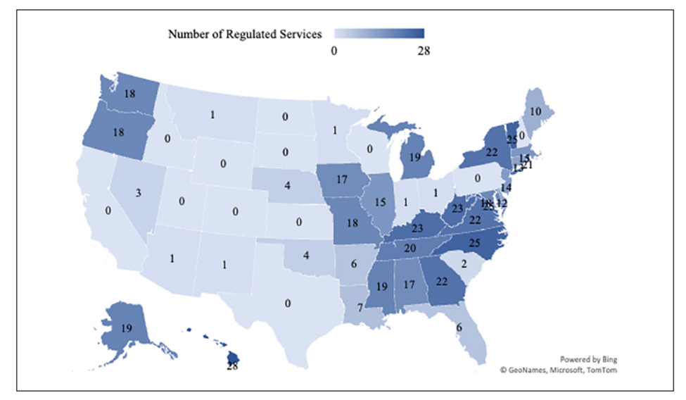 Figure 1 summarizes the number of health care services subject to CON regulation while Table 1 identifies the services most commonly regulated. Arizona, Minnesota, and New Mexico limit CON requirements to ambulatory services while Indiana, Ohio, and South Carolina (as of 2025) only apply CONs to nursing homes. Hawaii regulates the most activities, requiring CON approval for 28 services and technologies. Mitchell finds that nursing home beds are the most frequently regulated, followed by psychiatric services, new hospitals, and intermediate care facilities for individuals with intellectual disabilities. Investment thresholds triggering CON review vary from state to state and are generally lower for non-hospital providers (a $3 million expenditure trigger for ambulatory services in Maine) than for hospitals (excess of $12.365 million in capital expenditures in Maine).