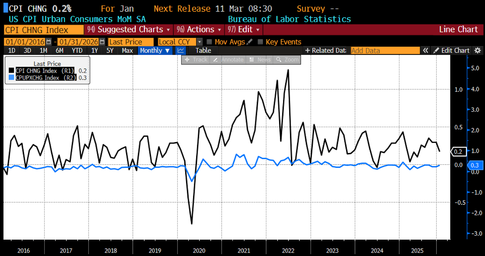 January 2026 US CPI headline and core month-over-month (2016 – present)