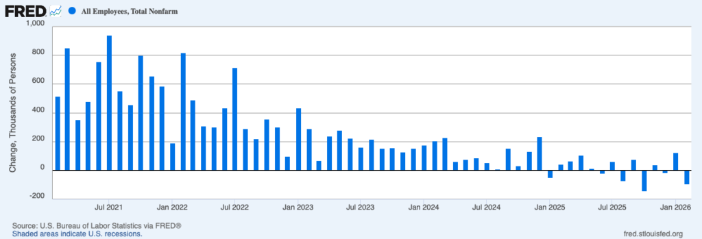 Many market watchers are concerned about the softening labor market. According to the Bureau of Labor Statistics, the US economy lost 92,000 nonfarm payroll jobs in February 2026. The revised payroll numbers reveal that the economy added just 156,000 jobs over the last year — or, roughly 13,000 jobs per month. That certainly looks sluggish relative to earlier reports. For comparison, the economy added roughly 122,000 jobs per month in 2024 and 210,000 jobs per month in 2023.