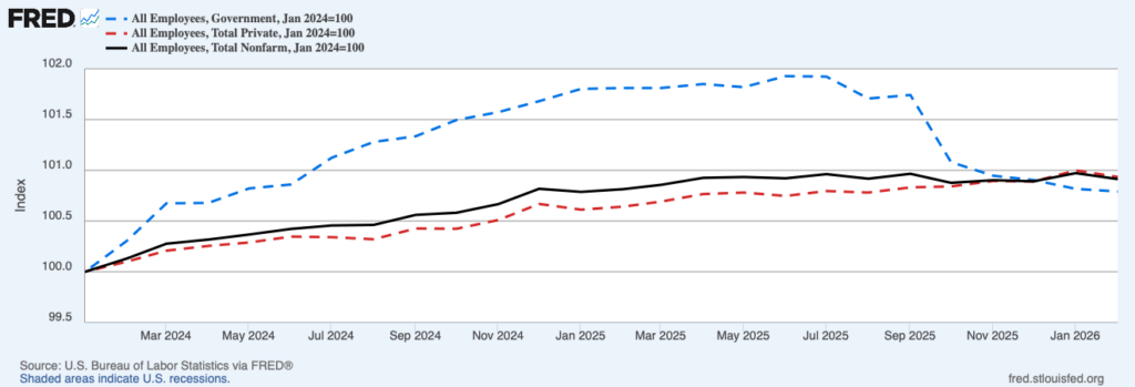 Figure 3. Government and Private Employment, Jan 2024 – Feb 2026
