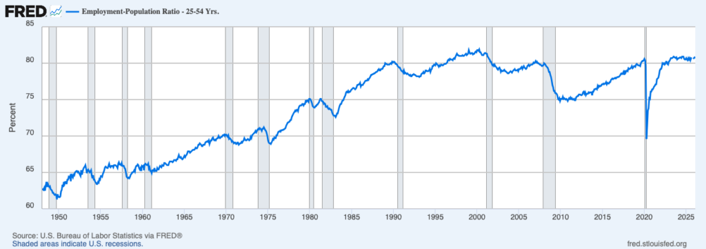 Consider the prime-age employment-to-population ratio, which shows the share of people in the US between the ages of 25 and 54 who are currently employed and, correspondingly, tends to be a good indicator of labor market strength. In February 2026, 80.7 percent of prime-age workers were employed. That’s relatively high by historical standards.