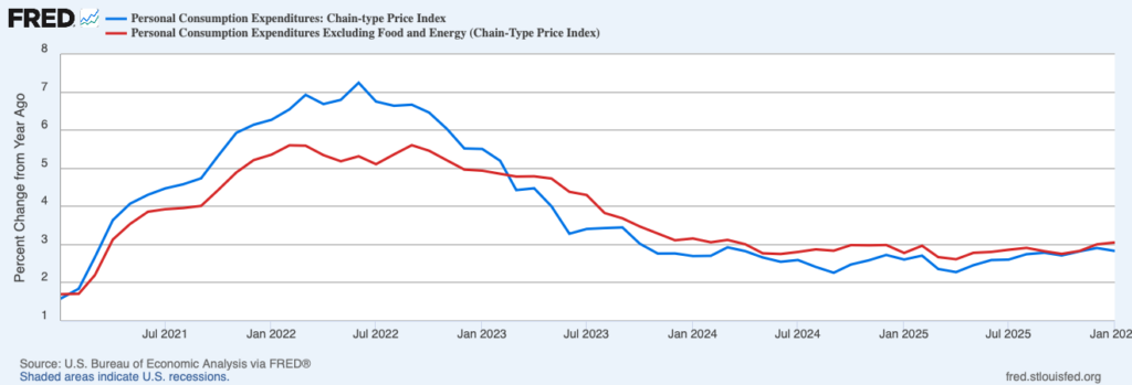 Figure 1. Headline and Core Personal Consumption Expenditures Price Index Inflation, January 2021 – January 2026
