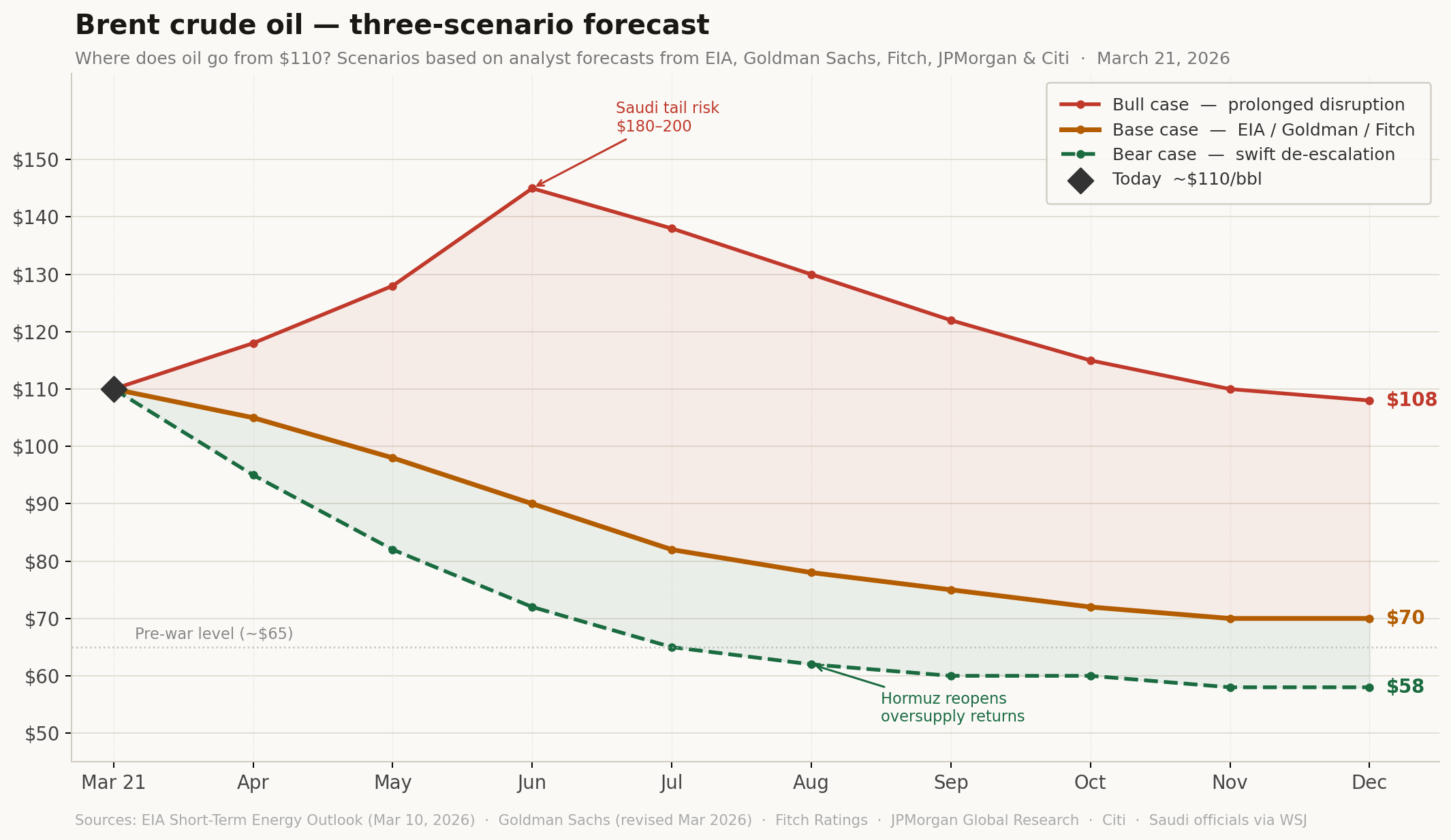 Seasoned analysts forecast Brent easing to $70–80 by year-end. Their bull-case is $150. Saudi officials have privately floated $180 if disruptions extend into late April.