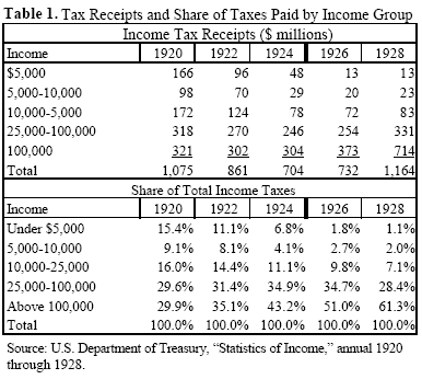In fact, when it comes to the share of taxes collected, Coolidge was more progressive than his predecessors. By 1928, over 60 percent of annual income taxes paid came from those earning over $100,000, up from just under 30 percent in 1920 (Table 1, courtesy of Cato.org). Households earning that much in the 1920s would be earning about $1.8 million today, and are subject to a top marginal tax rate of 37 percent. That top rate now kicks in at $640,600 for single filers ($768,700 for married couples filing jointly).