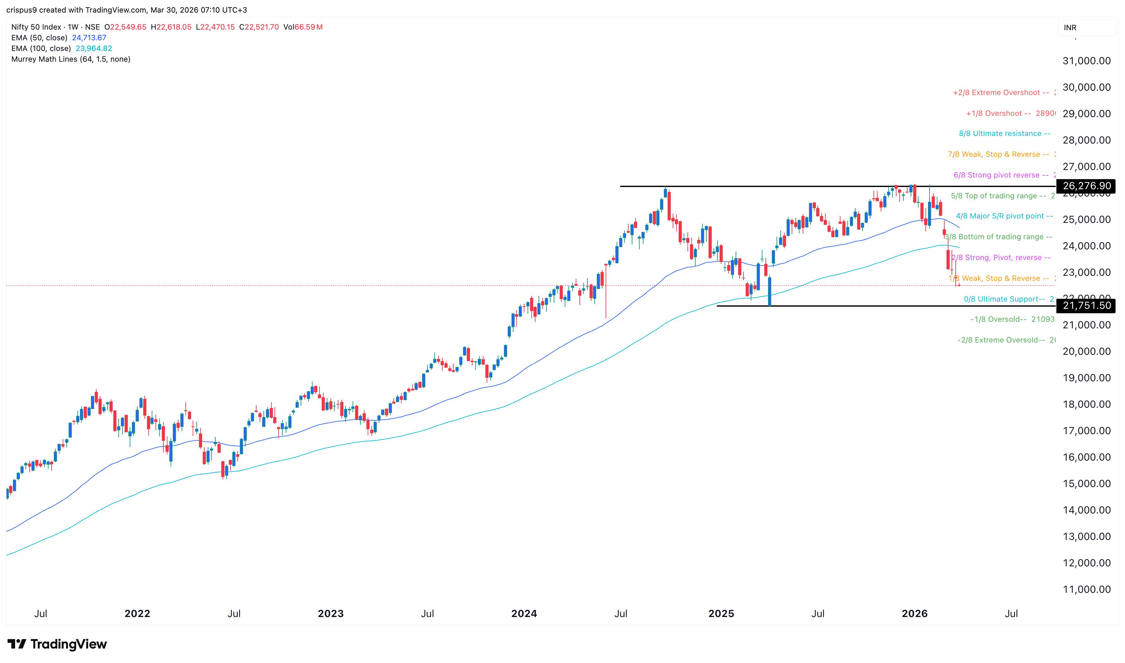 The index has already moved below the 50-week and 100-week Exponential Moving Averages (EMA), a sign the bears are in control. Also, it has dropped below the weak, stop & reverse part of the Murrey Math Lines tool.