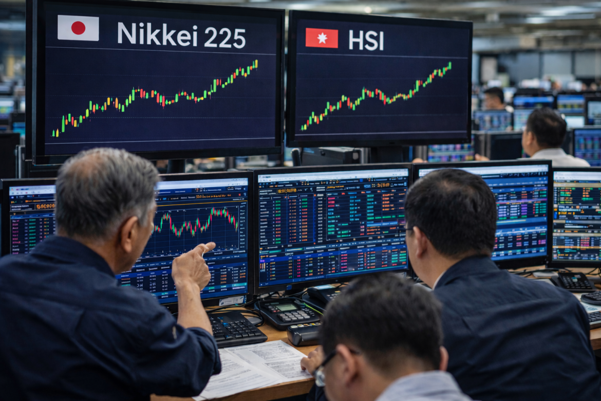 Traders monitor multiple screens showing Nikkei 225 and Hang Seng Index charts in a busy Asian stock trading room.